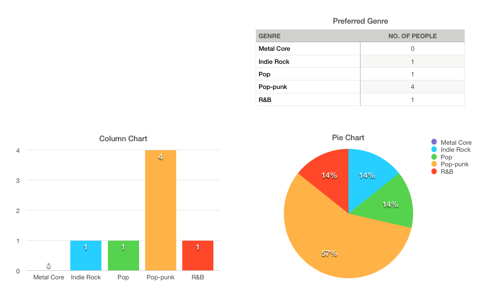 The first chart is on the preferred genre. In this case, I listened to what the audience preferred as they voted pop-punk. I also wanted to do pop-punk anyway because I feel it is a good genre to stick to conventions.